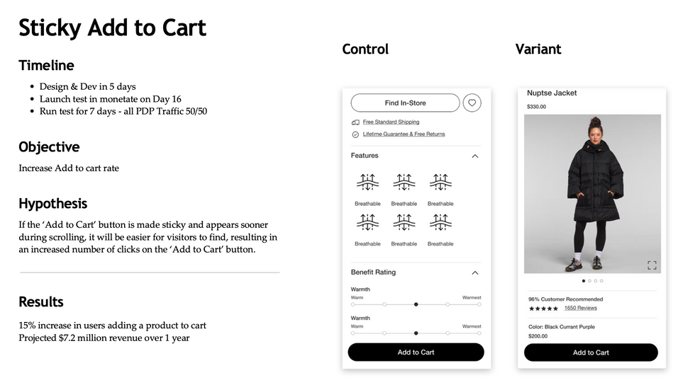 Sticky Add to Cart (ATC) : Made the ATC button persistent on product pages, resulting in a 15% lift in ATC rate and a projected $7.2M in annual revenue.